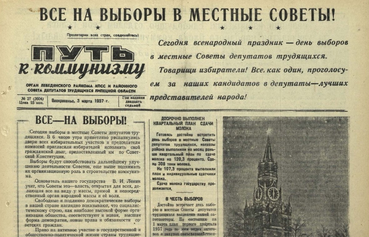 Организованно и дружно проходило голосование на Сезеновском избирательном участке №21. Он празднично оформлен. С раннего утра непрерывно слышны мелодичные звуки гармоники. Танцы, песни, пляски, игры. Вечером в избе-читальне силами кружка художественной самодеятельности для избирателей был дан хороший концерт", - рассказал на страницах районной газеты секретарь парторганизации колхоза "Верный путь" И. Поляков.